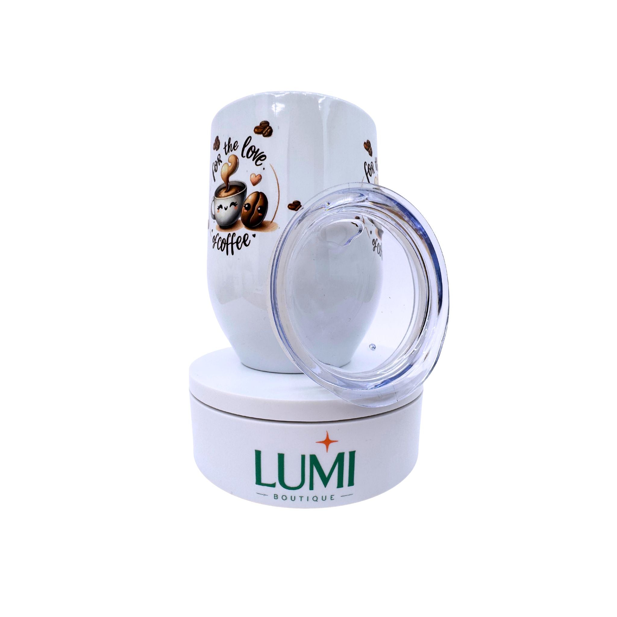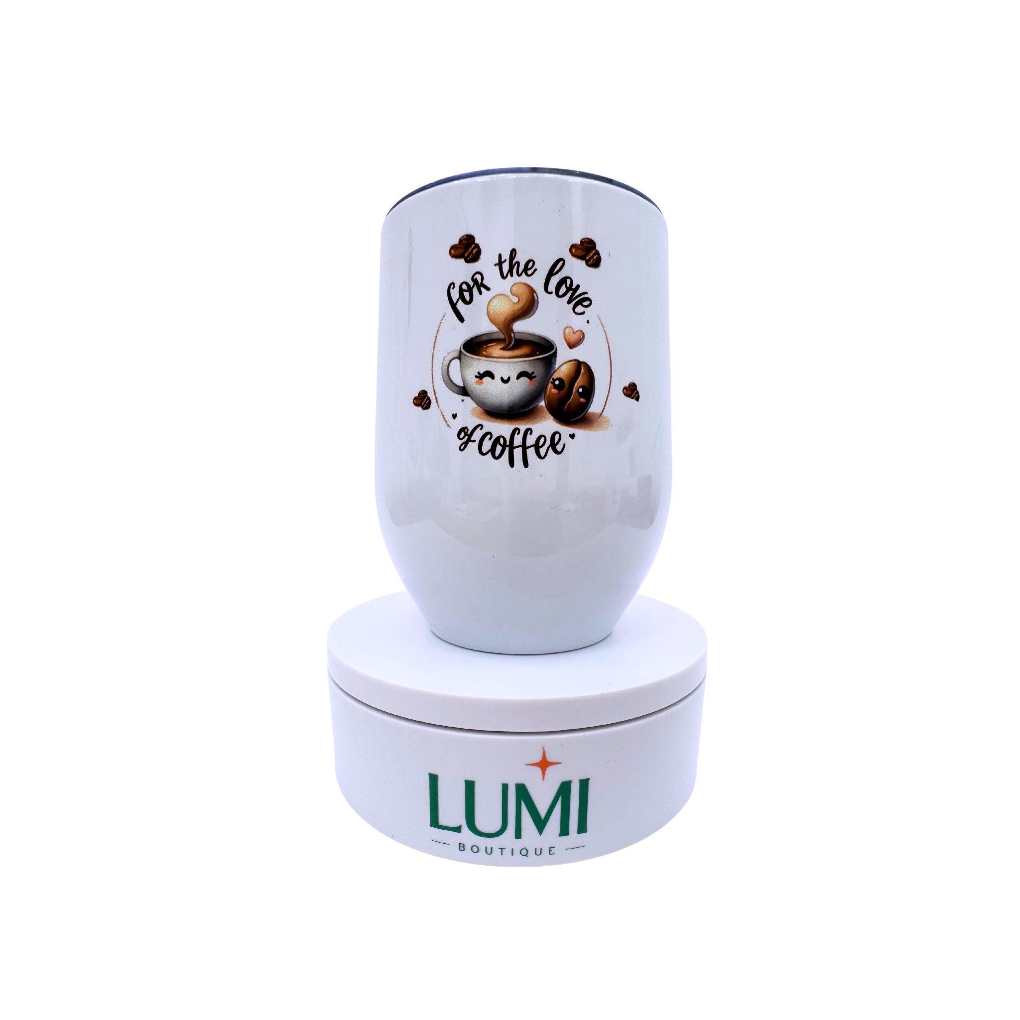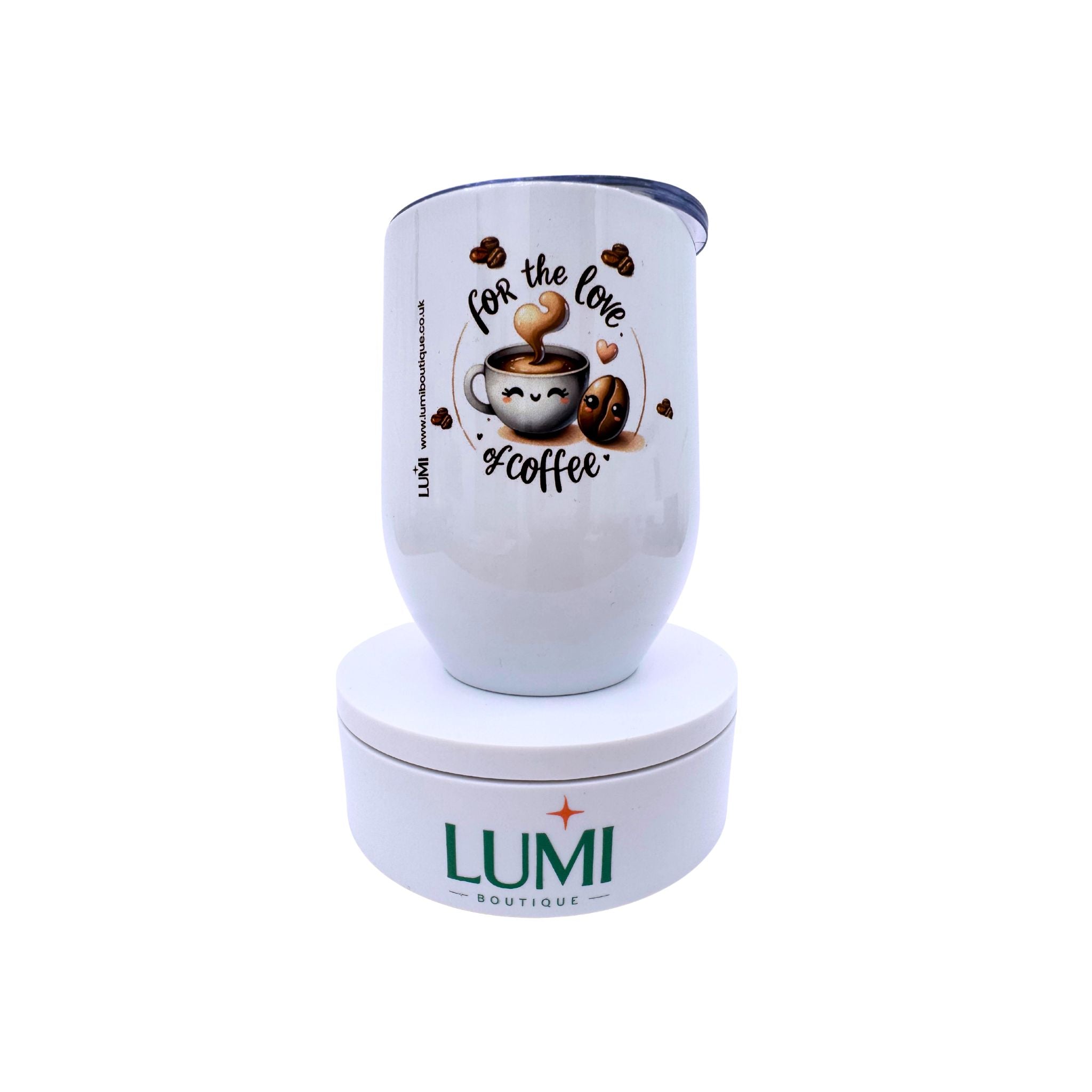 Deluxe white tumbler with a For the love of coffee design 12oz