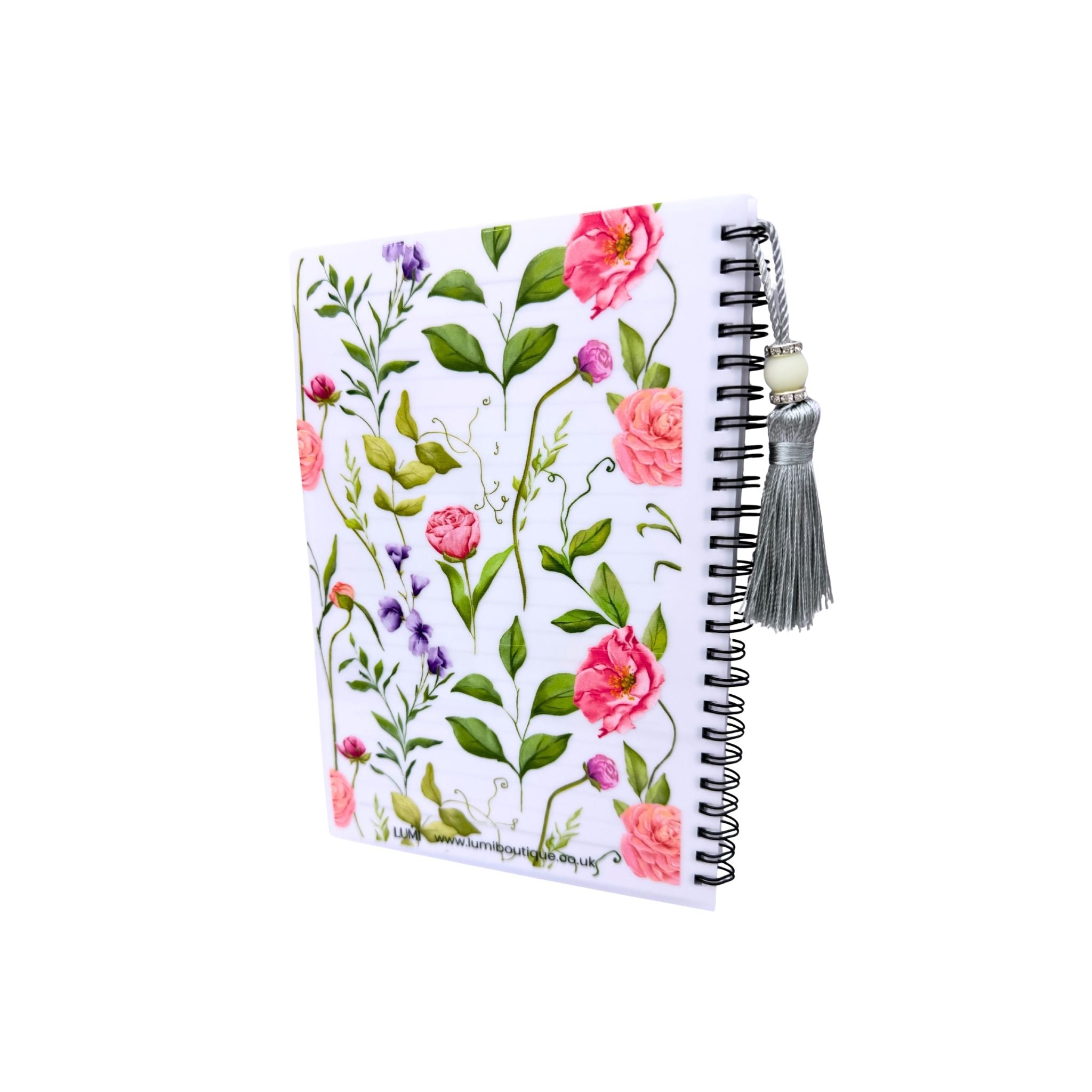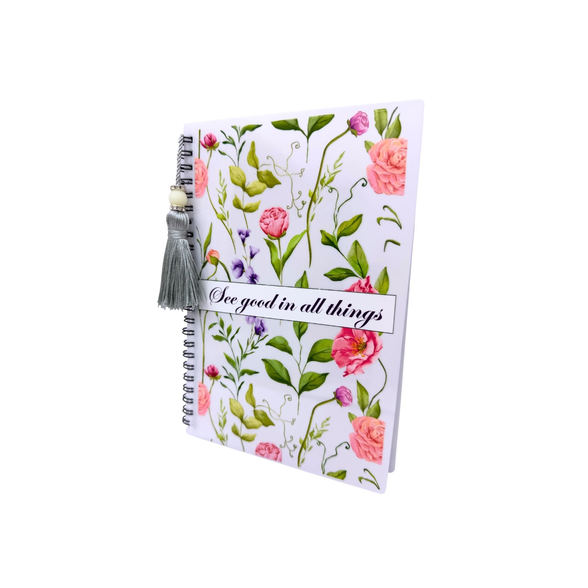 Notebook with tassel and Floral design and 'See good in all things' text .