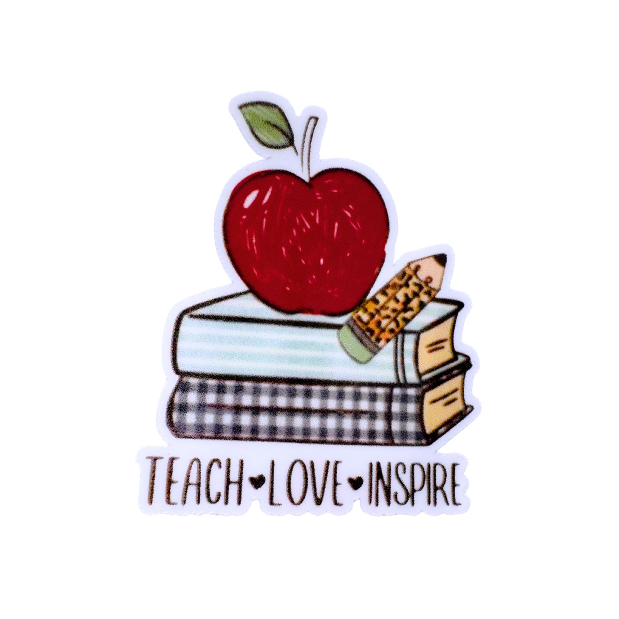 Sticker with a red apple on books and a pencil, with 'Teach Love Inspire' text design
